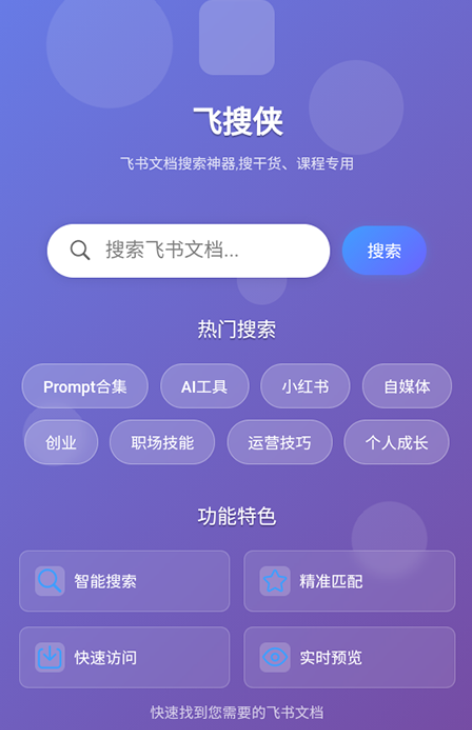 飞搜侠v1.0是一款专为飞书用户打造的文档搜索应用,能够在安卓设备上通过输入关键词快速定位公开的飞书文档,并提供一键打开功能。它简化了在大量文档中查找信息的流程,为需要频繁浏览和引用飞书资料的用户节省了大量时间。