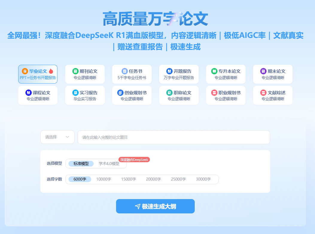 AI论文大师是一款利用DeepSeeK满血版深度训练模型实现自动生成万字论文的学术写作系统。输入题目即可生成可编辑大纲及正文,生成文档逻辑清晰,文献真实可查,查重率低于知网标准,文章长度最高可达30000字。平台接入10大权威数据库,支持免费无限在线改稿,覆盖毕业论文、期刊论文、开题报告、任务书、专升本论文及文献综述等多种文体,覆盖816个专业领域。每个章节支持自定义大纲、数据表、公式和代码的插入,生成论文质量卓越且符合学术规范。系统集成Deepseek R1、kimi及豆包AI三大前沿模型,采用语义重组与学术术语替换双重防护,大幅降低重复率和AIGC痕迹,确保论文通过率显著提升。平台同时提供AI PPT自动生成与答辩PPT模板服务,实现从论文初稿到开题报告,再到答辩材料的一站式学术写作支持。