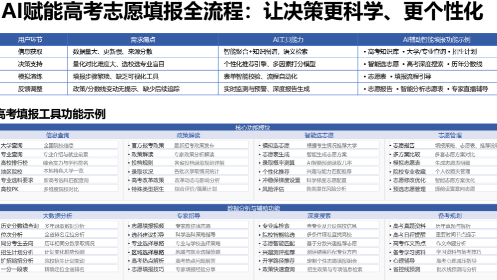 这是一份报考指南《AI赋能教育 :高考志愿填报工具使用指南》,本指南由清华大学新闻学院与人工智能学院团队联合编撰,面向首次填报高考志愿的考生及家长,揭示了信息获取、决策支持、模拟演练与反馈调整四大环节中的痛点,并基于 AI 深度学习、知识图谱与大数据分析,提供一站式智能解决方案。覆盖从基础批次概念到进阶案例、从通用策略到个性化推荐,全流程协同赋能志愿填报。