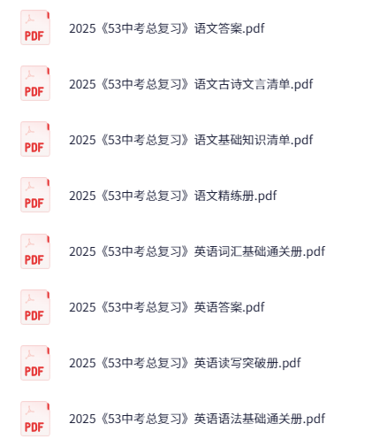 2025年《53中考总复习》7科全套(全国版),夸克网盘课程。这套2025年全国版《53中考总复习》覆盖中考7大核心科目,包含语文、数学、英语、物理、化学、历史、道法的完整复习体系。每科配备答案详解与专项训练组合,语文科目特别设置古诗文言清单和基础知识手册,英语学科则细分词汇语法双通关及读写专项突破。物理、化学等理科科目采用讲练结合模式,历史与道法科目配置精讲精练双路径。整套资料针对全国中考命题趋势设计,通过答案精析帮助考生查漏补缺,配合分层训练实现知识巩固与能力提升。