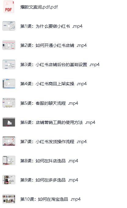 小红书电商运营从入门到精通,这是一套覆盖小红书电商完整链路的实操课程,包含入驻与开店、后台设置、商品上架、客服与发货、内容生产与发布、站内外选品、活动与优惠配置、数据分析与复盘,以及私域导流与变现。配套资料含《店铺入驻全流程》《爆款文案词》,并附「看课指南」便于快速上手。