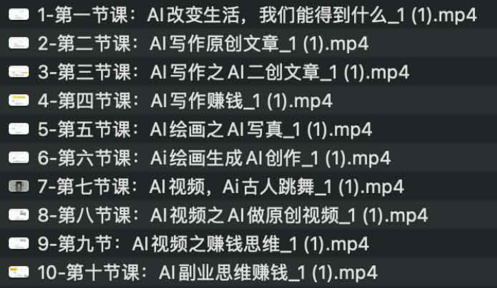 AI改变生活(Ai写作+AI绘画+Ai视频),AI副业挣钱,这套课程聚焦AI在个人创作和副业中的应用,内容涵盖AI写作、AI绘画和AI视频等多个方向,帮助学习者掌握从工具使用到变现思维的全流程。无论是希望写出原创文章,还是借助AI生成图片、视频,再到结合副业赚钱模式,课程都提供了完整的思路与操作路径。