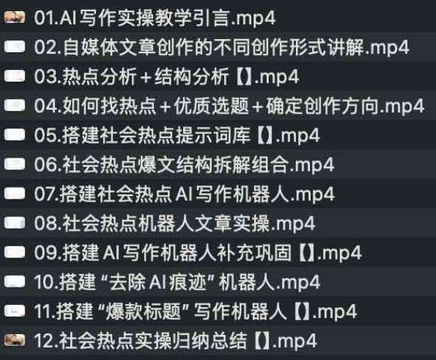 AI 写作社会热点实操教程,快速产出高热度内容,这套《AI写作社会热点实操课程》聚焦于如何借助AI工具和方法,在自媒体平台快速创作出高热度内容。课程从写作基础、热点选题、提示词库搭建,到爆款结构拆解与机器人实操,全流程覆盖,帮助创作者提升内容效率与质量。