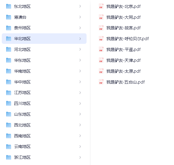 我是驴友 国内旅游攻略PDF,按照省市打包文件,该合集汇集了全国主要旅游目的地的攻略PDF文件,涵盖东北、云南、华东、华中、华北、华南、四川、山东、江苏、河北、浙江、港澳台、西北、西南和贵州等区域。每个地区均包含重点城市与景点的详细资料,适合自由行、亲子游、深度游等不同需求的游客参考。